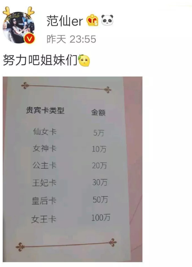 當然,范冰冰美容院開業后,大家也關注了一個問題,那就是消費到底是什么水平。而后,就有一位微博認證為范冰冰超級粉絲的網友,她發博曬出了店里的貴賓卡消費標準,并喊話大家要努力。